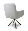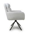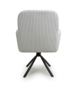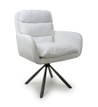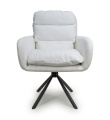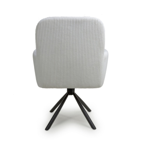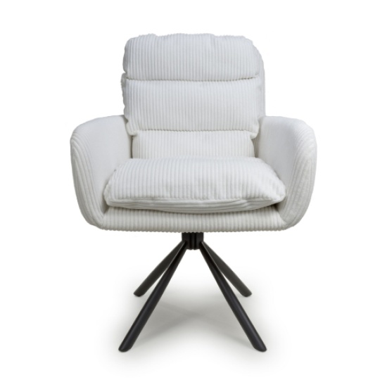 A deluxe cushioned swivel dining chair, upholstered in a beautifully soft, ribbed mink/white corduroy fabric. The large sloping bucket seat and high armrests provide incredible comfort. The chair comes with exquisitely contoured and pleated cushions, removable for easy cleaning. The black metal tripod base swivels 180 degrees before self returning. The 4 legs come with adjustable feet. Some assembly required.
