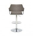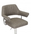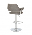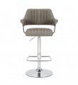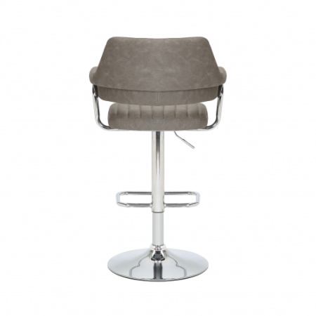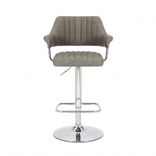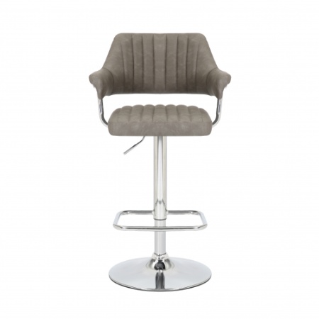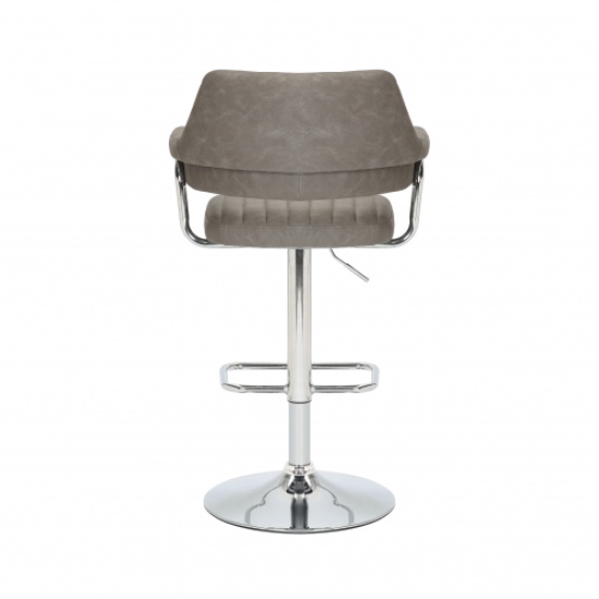 A striking contemporary bar stool, upholstered in mink/charcoal/light grey leather effect fabric. The floating seat and back are highlighted with ribbed stitch detailing. The layered back and arm rests are supported by a feature L shaped curved chrome bar. The rounded chrome base comes fitted with a large rectangular footrest. Height adjustable between 93cm to 113cm via a gas lift mechanism. The seat also easily swivels a full 360 degrees. Assembly required.