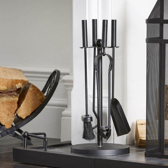 A simple fireside companion set with all you need to keep your fireplace tidy. The Ingelnook 5 Piece Round Base Black Companion Set features plain black rounded handles giving a modern feel to this essential item. Ideal for a modern fireplace or curved wood stove.
