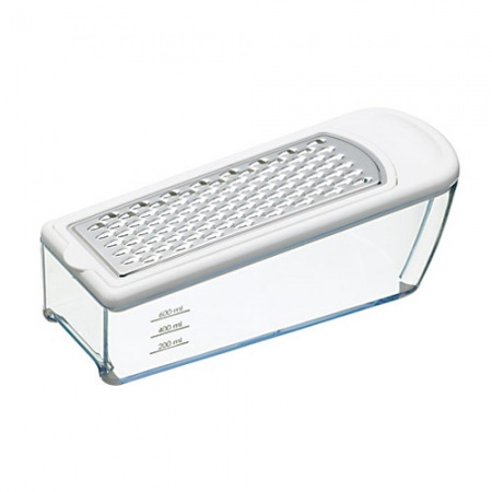 Multi purpose grater and storer set. Includes four interchangeable stainless steel blades for coarse and fine grating, zesting and slicing, plus a useful collecting base. Perfect for hygienic food preparation, the collecting base can then be used to store excess food and even features millilitre and cup measurements on the side (useful when following recipes). The base also has non-slip feet to keep a stable hold when grating and can be used to store the grating blades neatly away when not in use.
