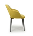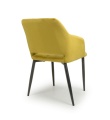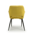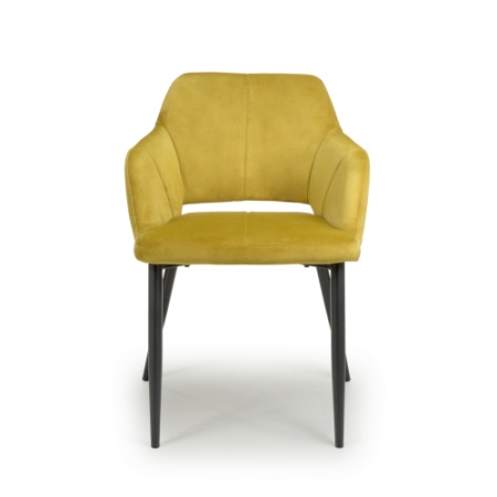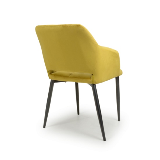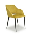 This contemporary angular dining chair comes upholstered in a striking burnt orange/lime gold brushed velvet. Features a stylish gap between the back and seat. Vertical stitching runs down the centre. Supplied with black metal legs. Assembly required.