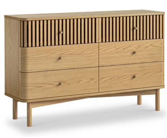 The Santi Oak Slatted 6 Drawer Chest offers exceptional storage capacity for bedrooms of all sizes. Arranged in three rows of two drawers, this wide chest provides organised space for clothing and personal items while maintaining a balanced, proportional silhouette.