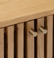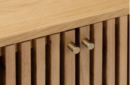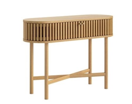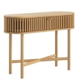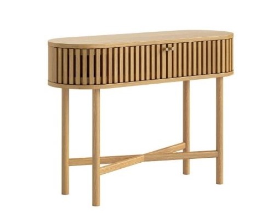 The Santi Oval Console Table brings contemporary elegance to your home with its distinctive slatted design and warm natural oak finish. The sleek oval top provides the perfect showcase for your favourite decorative items, while 2 handy doors open to offer discreet storage for everyday essentials.