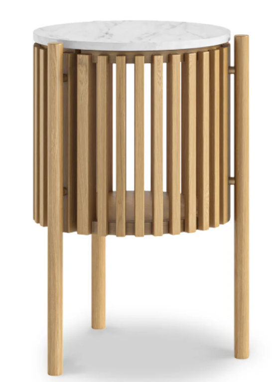 Discover the Santi Oak Round Side Table – a stunning blend of natural oak and oak veneers. This quality side table with storage showcases a great balance of style and practicality, providing an attractive addition to your living space.