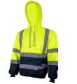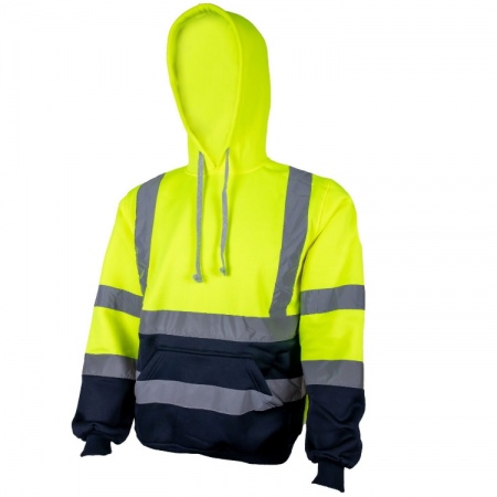 100% polyester, a kangaroo pocket at the front and draw cord through the hood make this a classic work Safety Hoody along with the 50mm high visibility reflective tape.