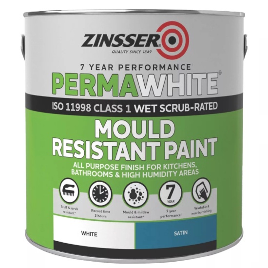 A mould resistant interior paint containing a biocode that protects the dried coating against fungal degradation, Perma-White® is designed to resist cracking, peeling and blistering for up to 7 years before first maintenance and is ideal for bathrooms and kitchens in particular.